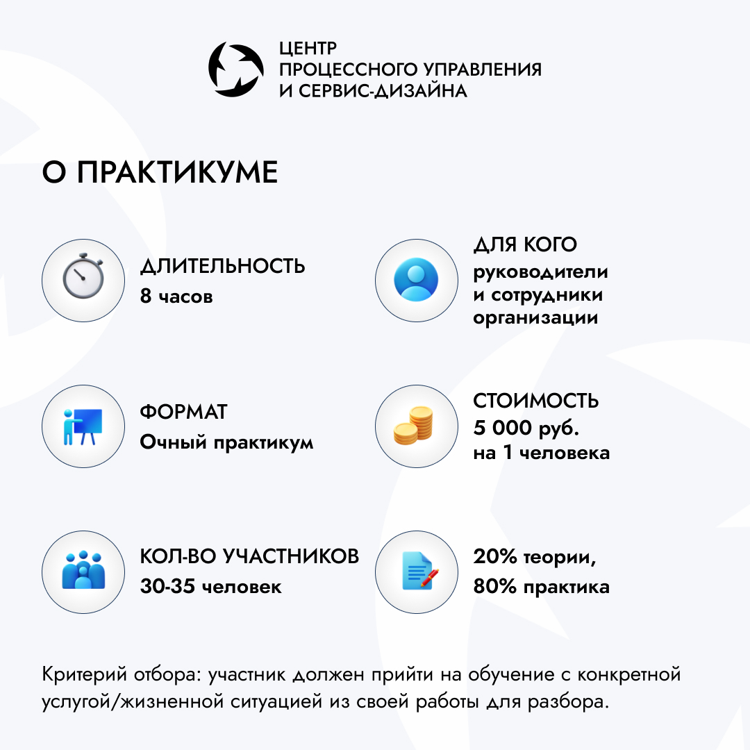 Участник должен прийти с конкретной услугой/жизненной ситуацией из своей работы для разбора.